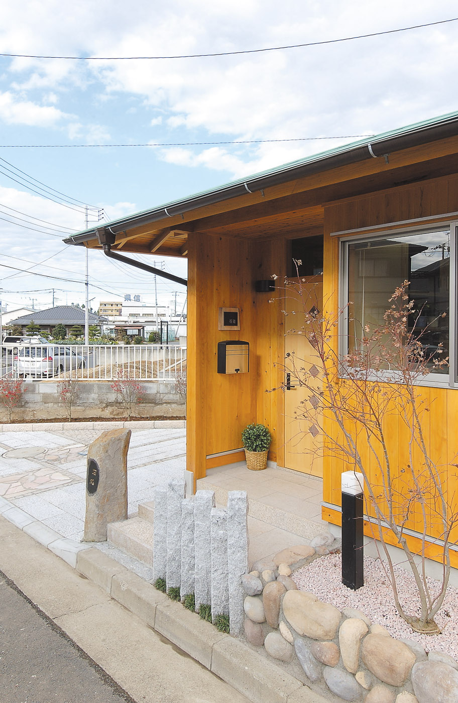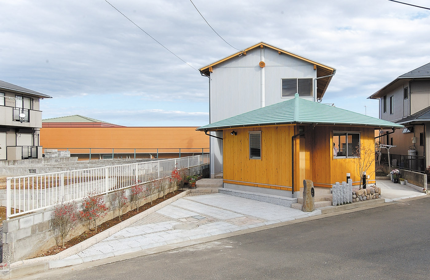 およそ67坪の敷地は道路側が45°になった台形をしています。離れの事務所を道路に合わせ傾けることで駐車スペースを確保、変形敷地を有効に利用しました。