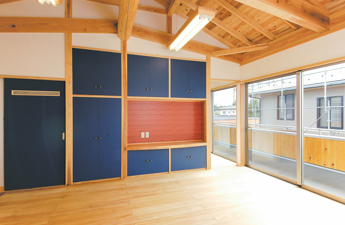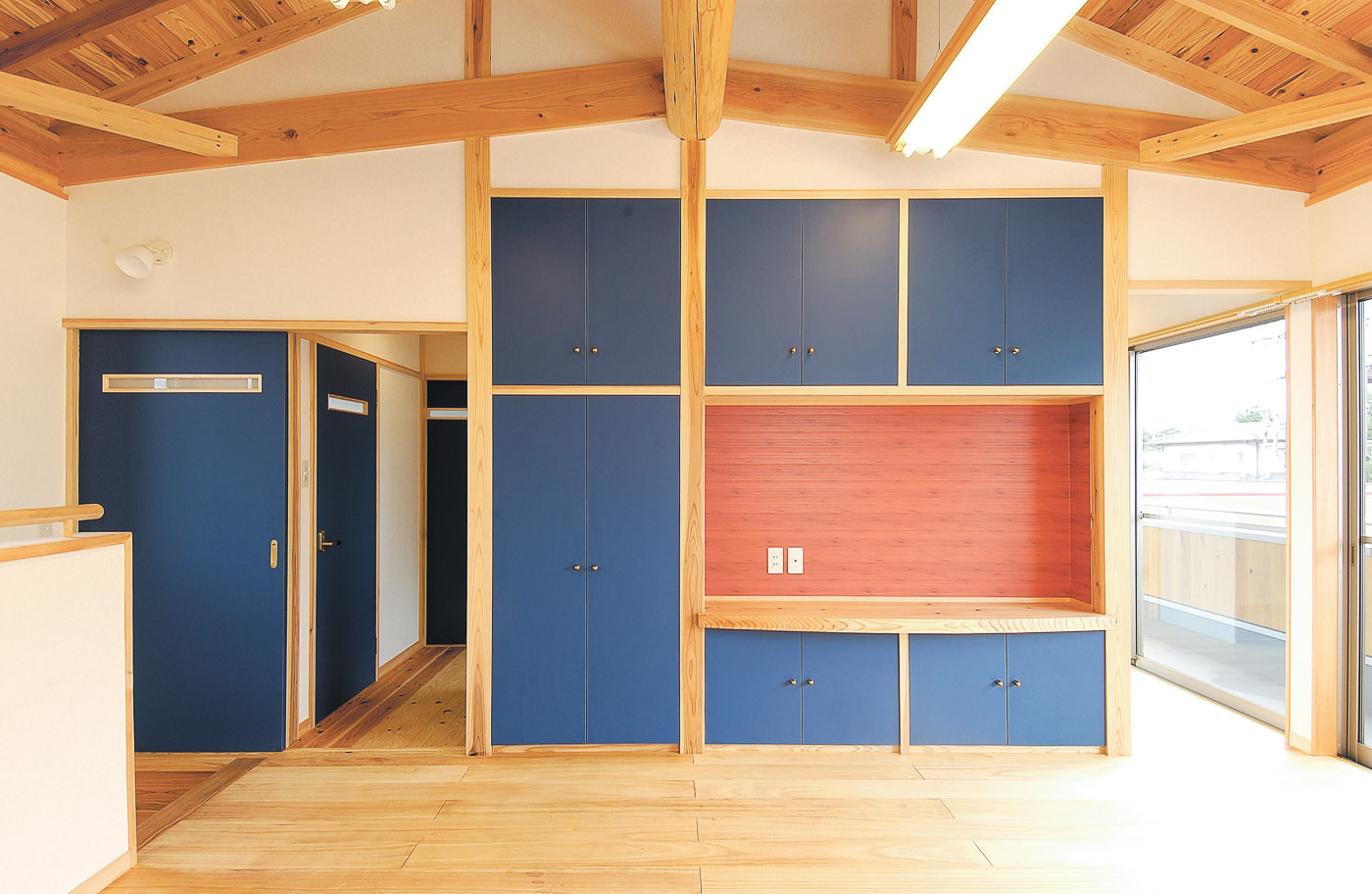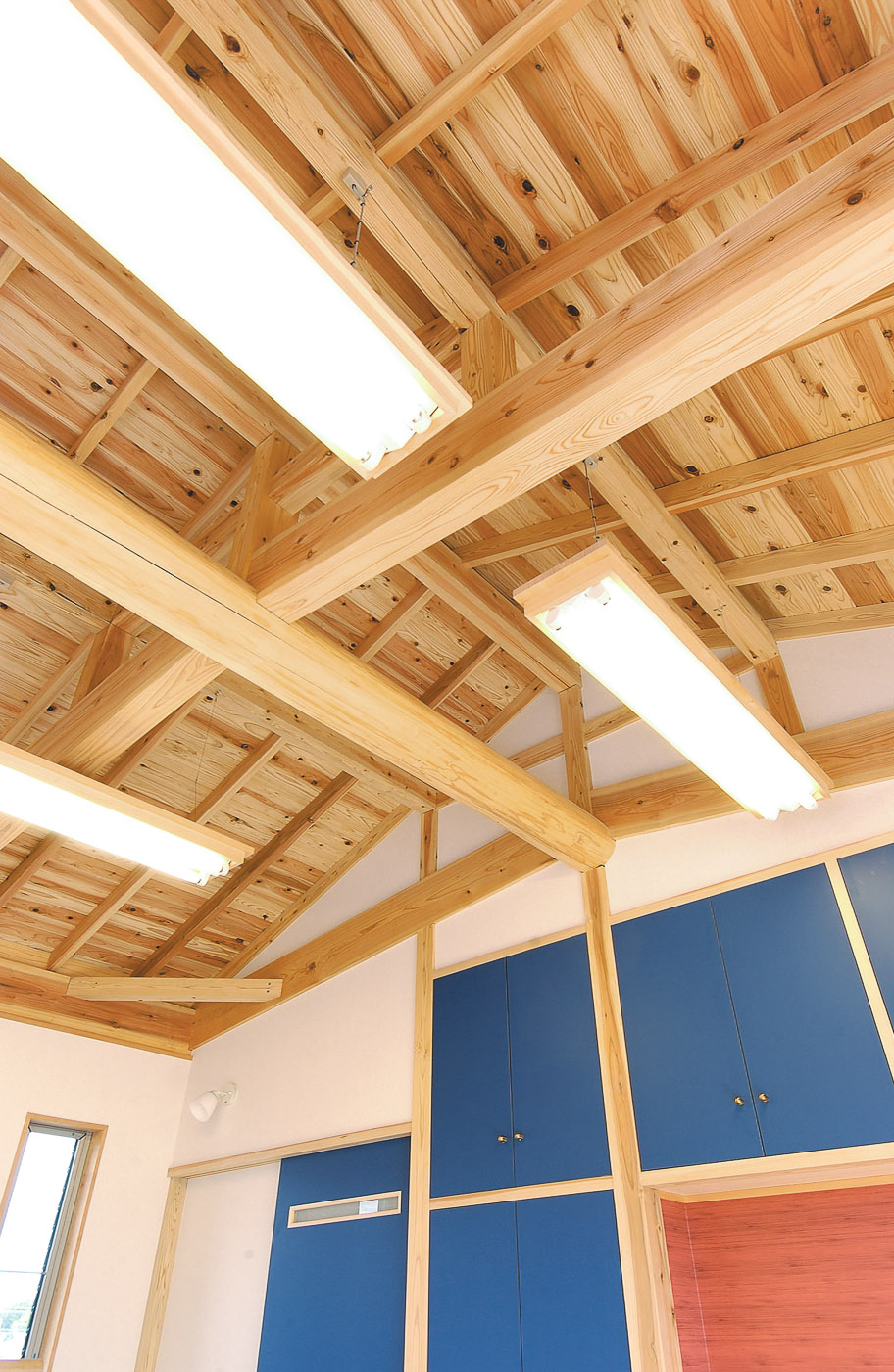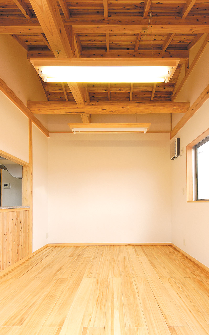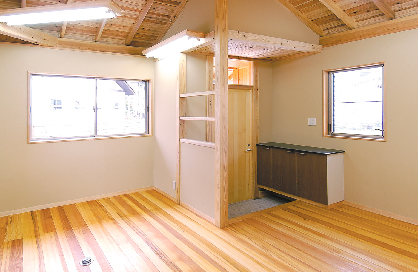 コストを抑えるために、あえて天井を張りません。杉の丸太の梁や屋根裏の杉板を見せることで、広々としたナチュラルな空間になりました。棚や扉などの家具は全て造作です。照明は業務用のもを大工さんに頼んでひと工夫。キリの無垢材を使用したフローリングは、素材の柔らかさと温もりが足の裏から伝わってきます。木材などの素材の質を落とさず、必要な機能を満たした上でローコストを実現。素材の特徴を生かした快適なすまいになりました。