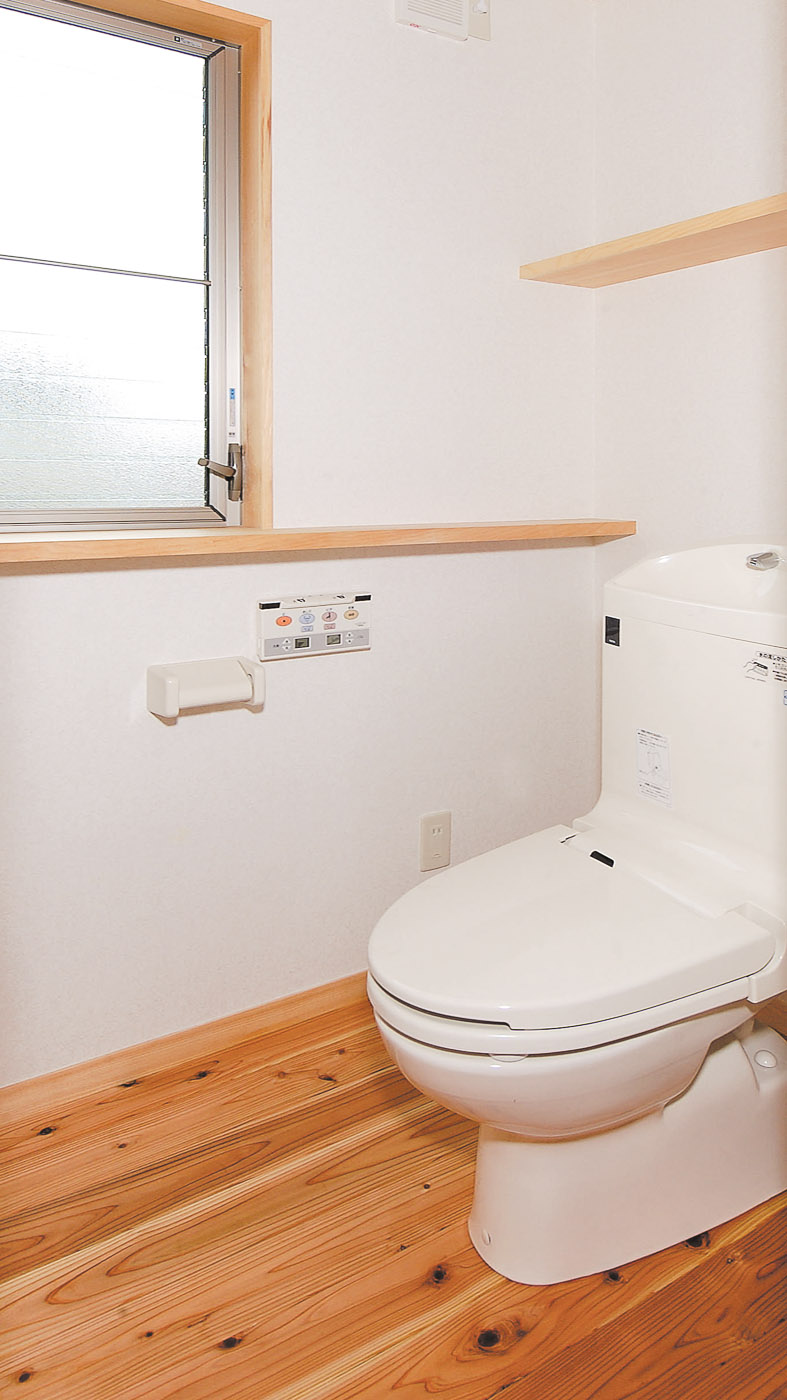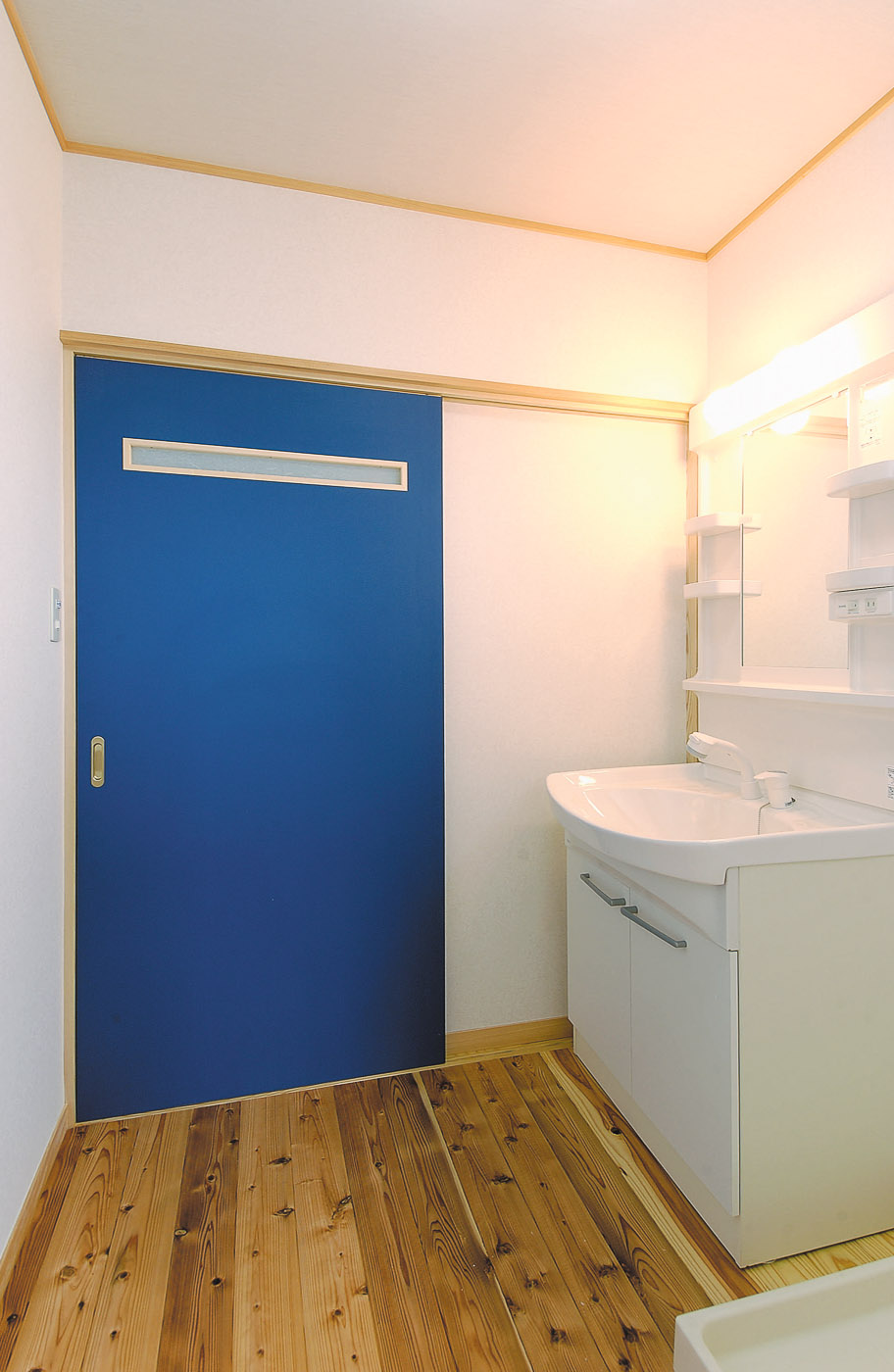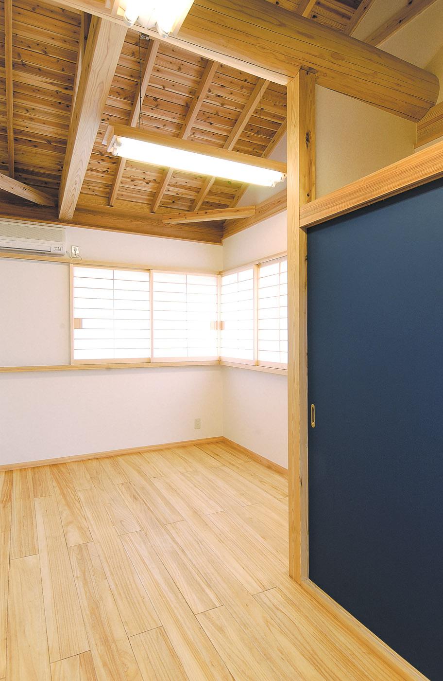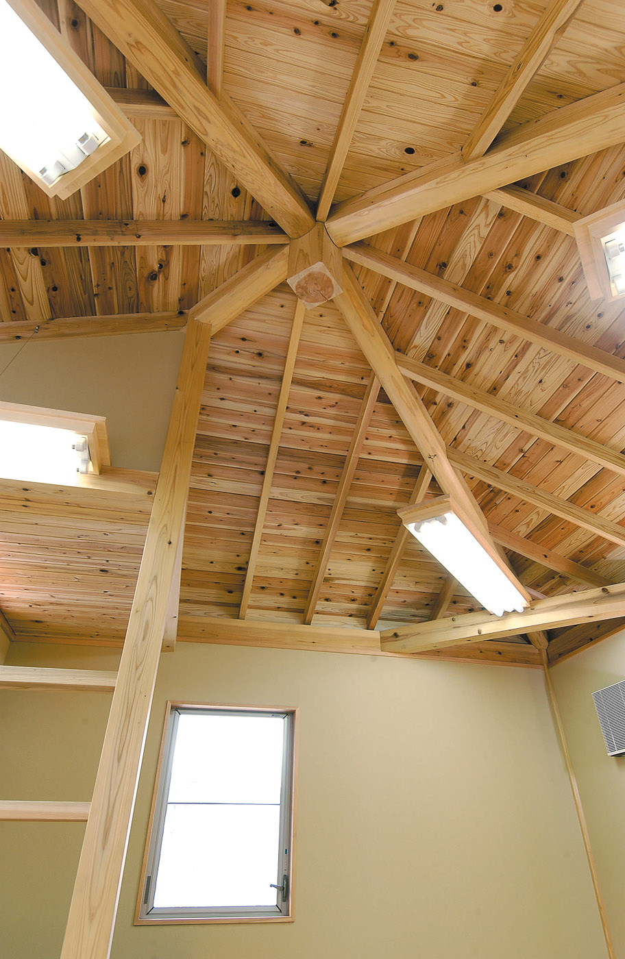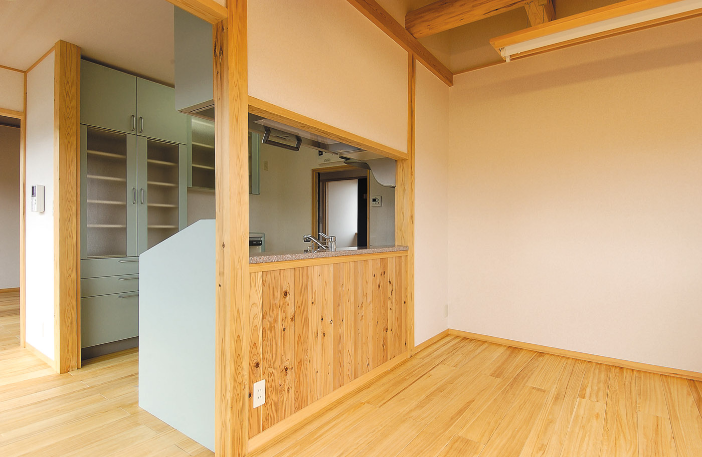 コストを抑えるために、あえて天井を張りません。杉の丸太の梁や屋根裏の杉板を見せることで、広々としたナチュラルな空間になりました。棚や扉などの家具は全て造作です。照明は業務用のもを大工さんに頼んでひと工夫。キリの無垢材を使用したフローリングは、素材の柔らかさと温もりが足の裏から伝わってきます。木材などの素材の質を落とさず、必要な機能を満たした上でローコストを実現。素材の特徴を生かした快適なすまいになりました。