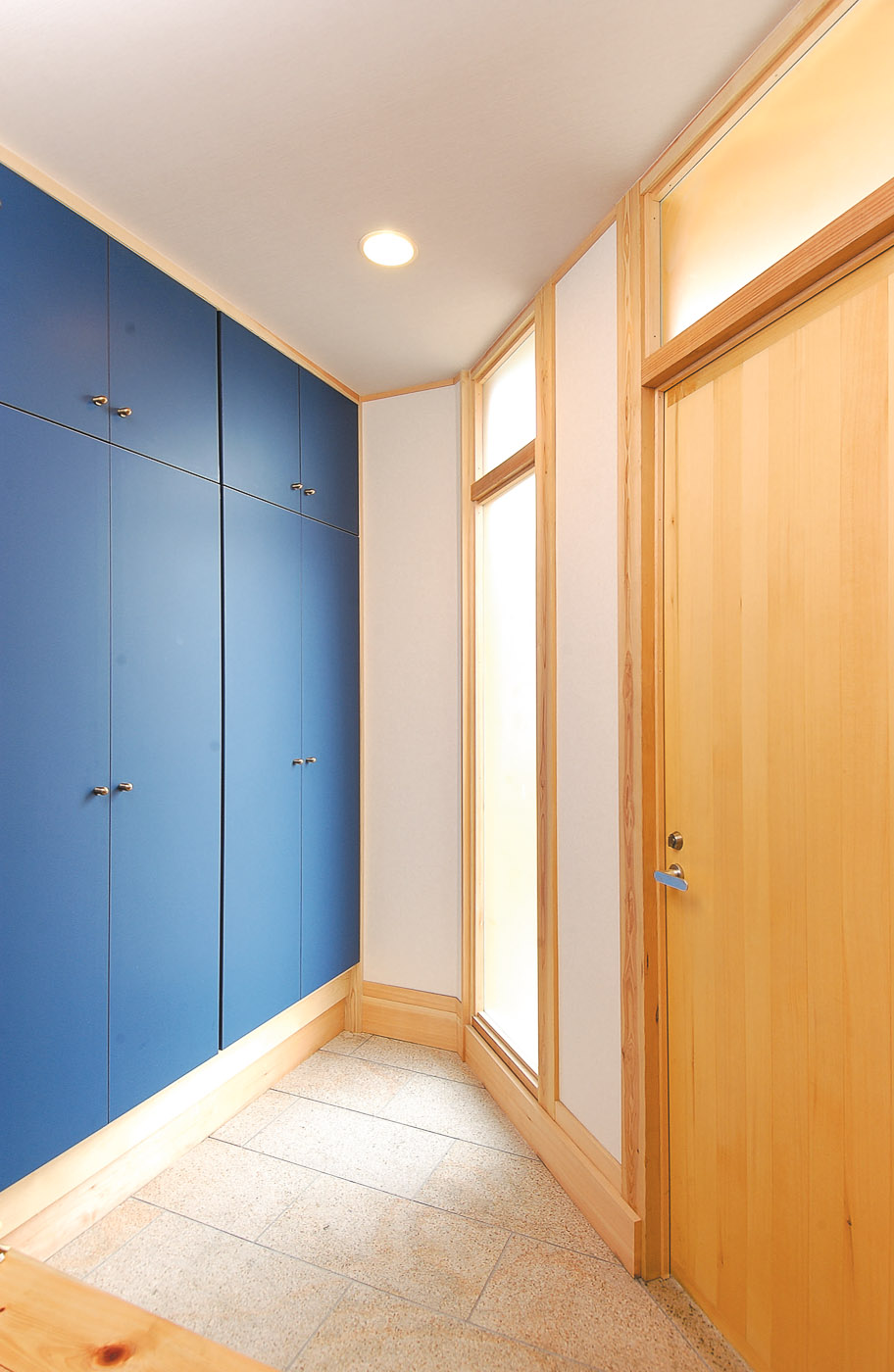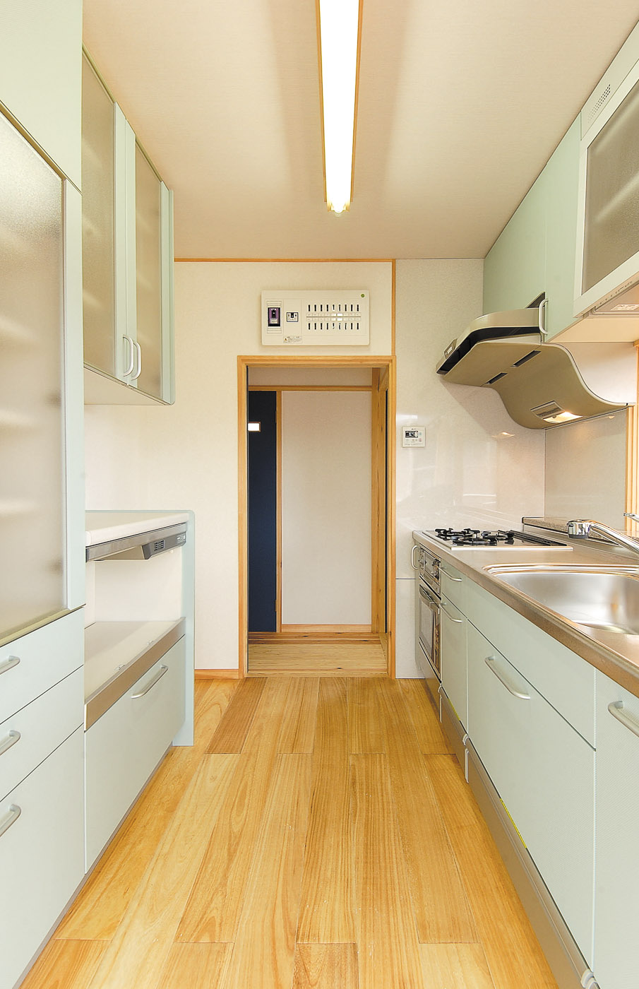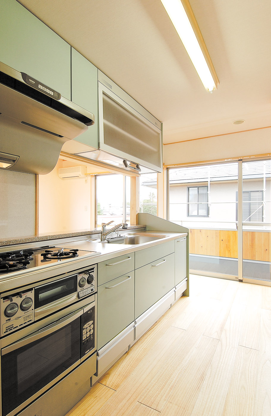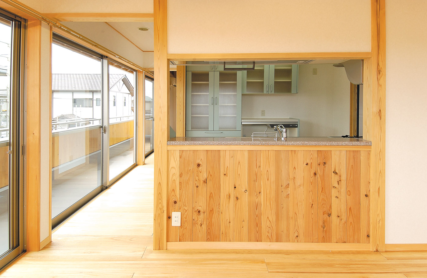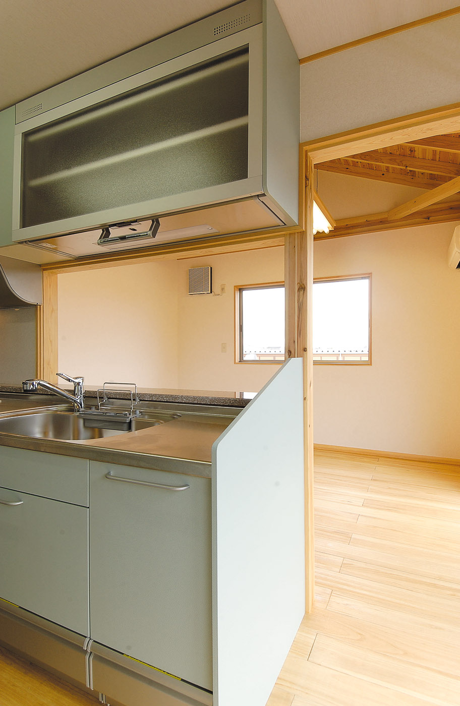 分譲地は住宅が近隣しているので、リビング、ダイニングなどの生活空間を2階にし、日当りや風通し、プライバシーを確保。リビングには仕事関係のお客様を招くことが多いので、家族の食事の時間がバラバラで雑多になりがちなダイニングが見えないように、キッチンで分けました。また、キッチンは廊下代わりにもなり、家族は来客時も気兼ねなく家の中を移動できます。