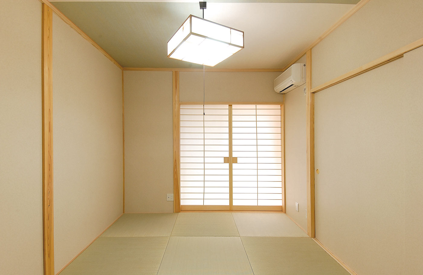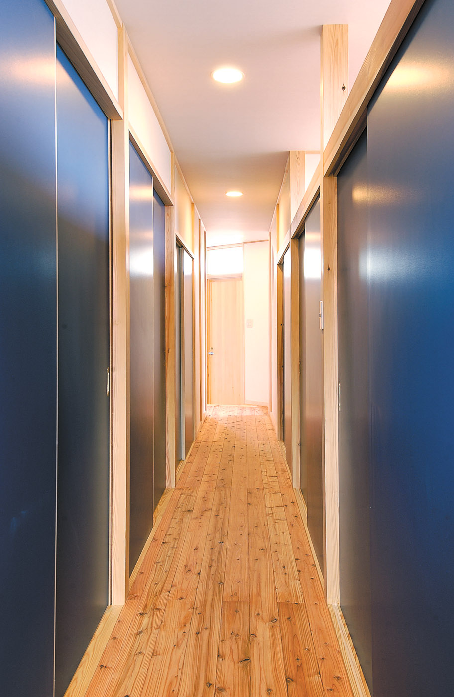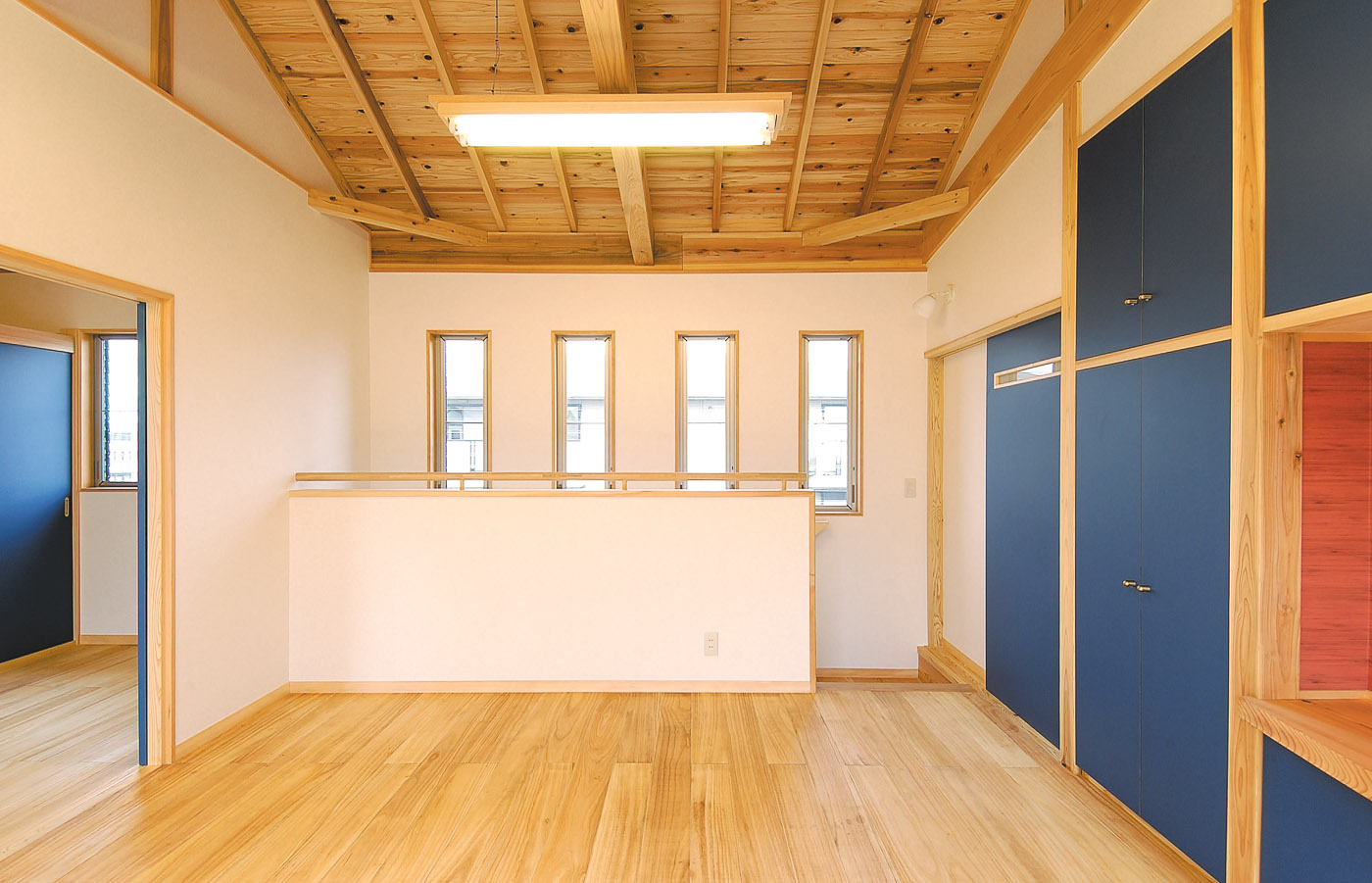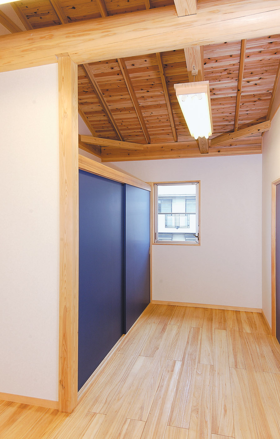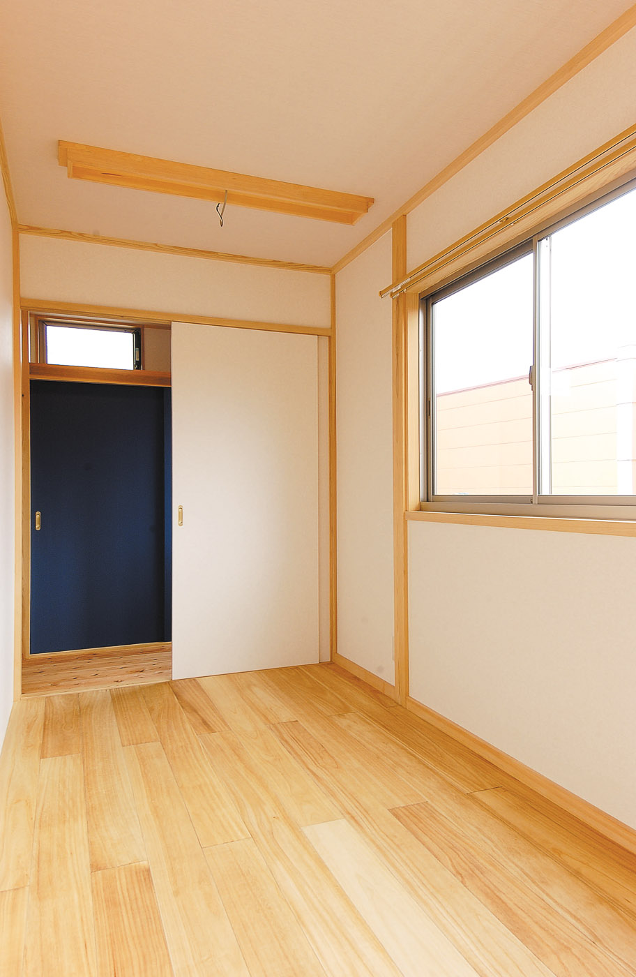 1階は客間の和室と子供3人の部屋。子供部屋は4畳と小さいながらも個室を確保。収納は部屋には設けず、廊下を挟んだ反対側にクローゼットを作りました。クローゼットの上には小窓を設け、子供部屋から入った空気を通す工夫をしています。和室は今はまだ小さい子供たちの遊び部屋になっています。